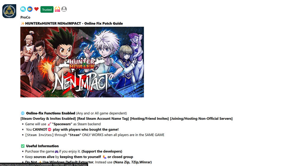 ✨HUNTERxHUNTER NENxIMPACT - Online Fix Patch Guide ✅ Helpful Guidelines Information ▪️If this guide was helpful/easy to follow, please give a 💖. ▪️Purchase the game🎮if you enjoy it. (Support the developers) ▪️Keep sources alive by keeping them to yourself 🫷 or closed group ▪️Reference to the FAQ's on my "Profile Comments" for any questions❓ ▪️Visit my 🔗Discord if you need any help with [Request Guides] [Get 1on1 Help With Anything] [Check more Detailed FAQ] [Easy Access To Information (No Direct Downloads)] [Find Players To Play With] [Get Updates On Online-Fix Patchs] [PC Geek Squard Help]