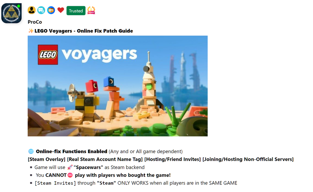 📜How To Find The Download Guides [Online-fix Patch & Game Info] 1️⃣ Click on the link 👉🏾🔗Guides Hub Link 2️⃣ Scroll down to the very bottom of the page 3️⃣ Click View All or Load More button 4️⃣ Click the CTRL + F and (Search for any game) or copy/paste or type the "✨LEGO Voyagers - Online Fix Patch Guide", 5️⃣Follow that 📜guides Instructions.