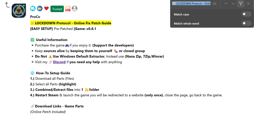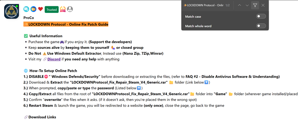2.) Press CTRL + F and type in the "✨LOCKDOWN Protocol - Online Fix Patch Guide" Follow the Instructions and check out the FAQ's for guides on common questions!