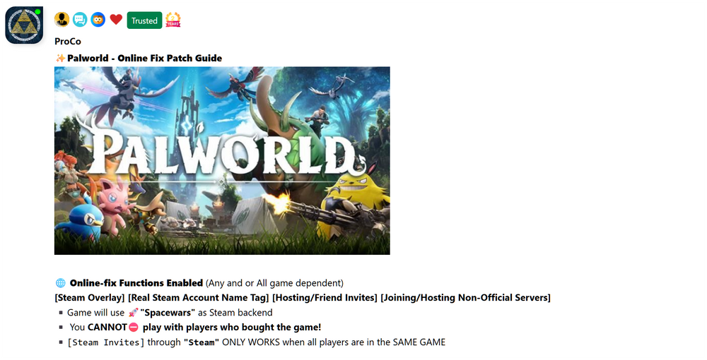 ✨Palworld - Online Fix Patch Guide ✅ Helpful Guidelines Information ▪️If this guide was helpful/easy to follow, please give a 💖. ▪️Purchase the game🎮if you enjoy it. (Support the developers) ▪️Keep sources alive by keeping them to yourself 🫷 or closed group ▪️Reference to the FAQ's on my "Profile Comments" for any questions❓ ▪️Visit my 🔗Discord if you need any help with anything pc and game related. [Request Guides] [Get 1on1 Help With Anything] [Check more Detailed FAQ] [Easy Access To Information (No Direct Downloads)] [Find Players To Play With] [Get Updates On Online-Fix Patchs] [PC Geek Squard Help]
