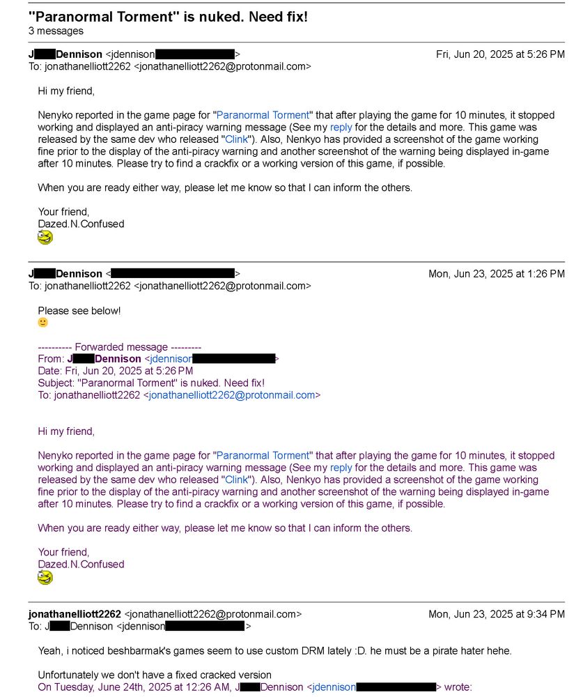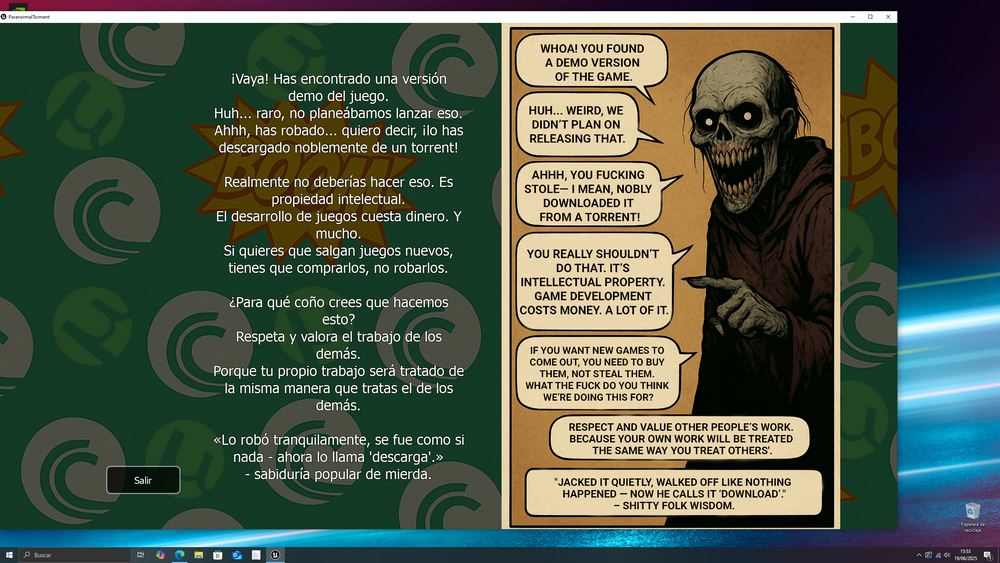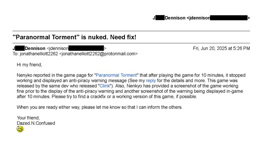I also checked TENOKE's .NFO file for this game posted on XRel but this game is not marked as being nuked. There's no evidence that the same problem exists in this game even though it does exist in the other game also made by the same dev. Can you please post 2 screenshots of this game in windowed mode with a small part of your Windows Desktop showing, if possible, in a reply comment? - One where this game plays fine before the "anti-piracy" message is displayed and one where in this game, the "anti-piracy" message is displayed? I need hard evidence if I am to email IGG, the administrator of this site, about this possible problem.