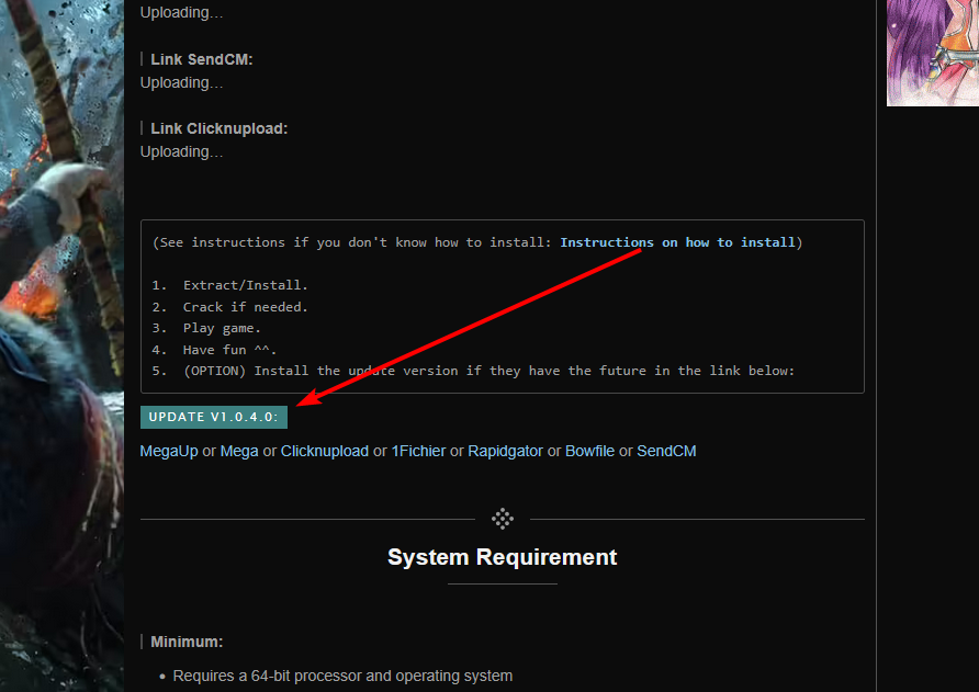 For new players who, like me, aren’t familiar with cracked games: you need to download and install all update patches in order, from the oldest to the newest, instead of just grabbing the latest one. That’s because each patch only contains the data that was changed from the previous version.