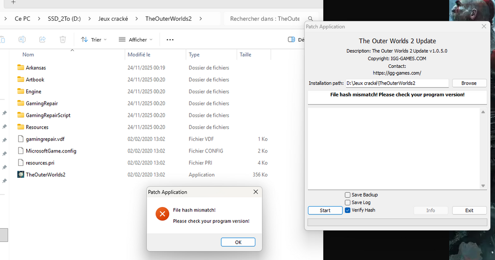 [!] Error! Invalid hash for: "C:\GAMES\TheOuterWorlds2\Arkansas\Content\Paks\Arkansas-Windows.ucas"