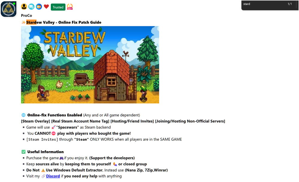 📜How To Find The Download Guides [Online-fix Patch & Game Info] 1️⃣ Click on the link 👉🏾🔗Guides Hub Link 2️⃣ Scroll down to the very bottom of the page 3️⃣ Click View All or Load More button 4️⃣ Click the CTRL + F and (Search for any game) or copy/paste or type the "✨Stardew Valley - Online Fix Patch Guide", 5️⃣Follow that 📜guides Instructions.