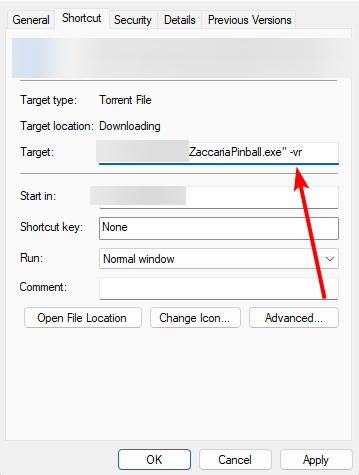 To run in VR mode, you create a shortcut for the exe file. Right click on exe -> Create Shortcut -> Then, right click on the shortcut you just created -> Properties -> Shortcut tab -> Add the string " -vr" (note the space before), as shown. Save it