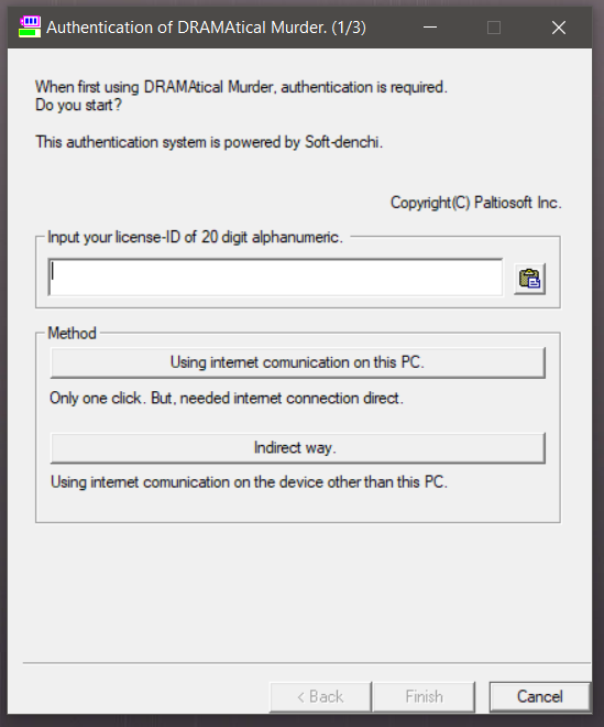 I'm installing Dramatical Murder. I've installed direct-x and other stuff for the black screen problems... and the game still won't load. I've run it as administrator. i've run it with japanese locale and administrator rights. annnd, I've copy and paste the crack into the root files too. It keep asking for authentication license id. Help me please T-T my laptop is windows 10 pro. 64-bit OS. 4GB RAM. i5-7200U processor. nvidia geforce 940MX.