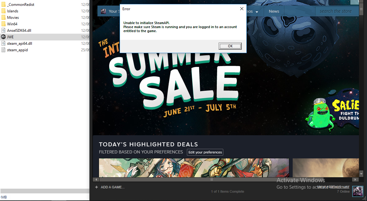 EVERY steam games close on startup in the "outputlog" there's 6 messages: Fallback handler could not load library (directory/)CSteamworks Fallback handler could not load library (directory/).\CSteamworks Fallback handler could not load library (directory/)CSteamworks Fallback handler could not load library (directory/)libCSteamworks Fallback handler could not load library (directory/).\libCSteamworks Fallback handler could not load library (directory/)libCSteamworks Please help! Desperately want to play couch games with my friends! this dont work