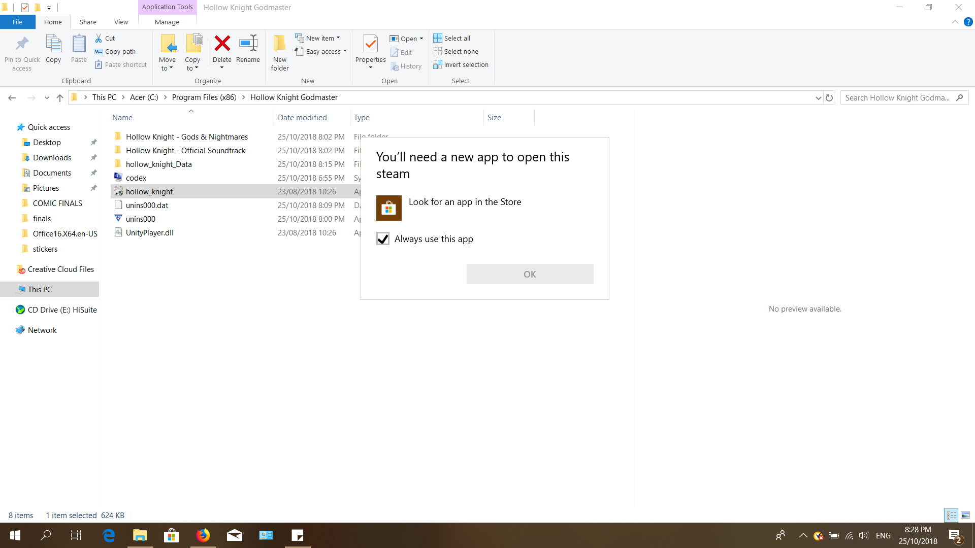 i copied and pasted all the files from he crack files to the game file , now it doesnt take me to steam anymore but it doesnt lunch , when i start it the window open in the taskbar for few seconds then disappear again ! im trying to lunch hollow knight , please help !
