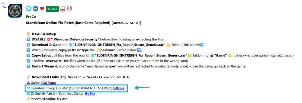 🌐How To Get The Online Game + Patch 1.) Click on the 🔗IGG Profile Link 2.) Press CTRL + F and type in the "✨ELDEN RING NIGHTREIGN - Online Patch Fix Guide"> now follow the Instructions and check out the FAQ's for guides on common questions! If you still haven't found the post yet 3.) Scroll all the way down to the bottom 4.) Click "Load All" or "Load More"(Because it's more or less at the bottom of the page on the second page in a sense) Pre-Patched Version Online Fix Patch Only Version