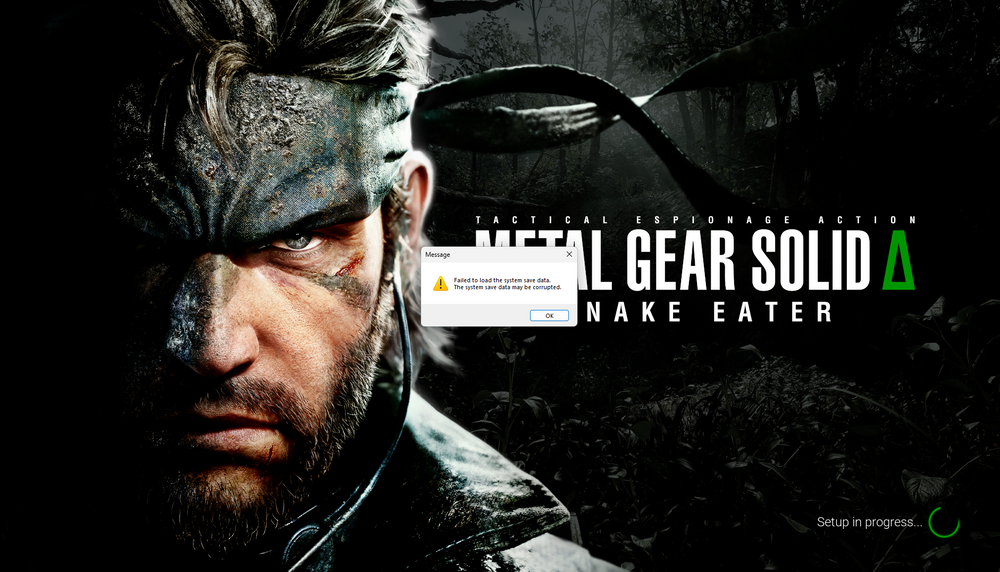 Thank you for the quick answer! Oh I am not interfering with the program at all. It shows the Metal Gear Solid Delta screen (with Snake), on the bottom right the "Setup in Progress bar" tunrs around a few times and then it goes to a black Screen that crashes.