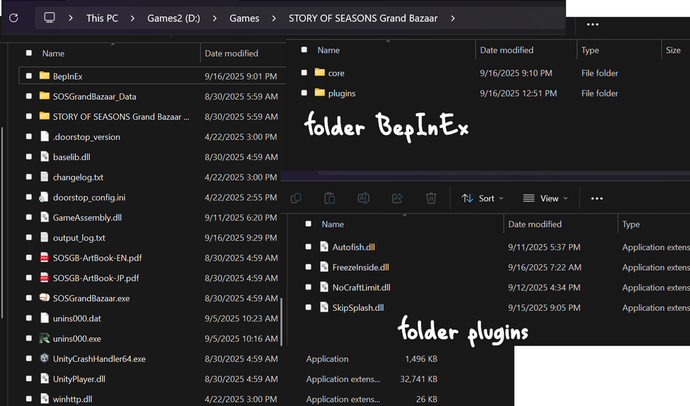 winhttp.dll must in same folder whit SOSGrandBazaar.exe. when u first start game , BepInEx will auto download "unity base libraries" make sure not have wrong whit it .(BepInEx\unity-libs will have 71 dll files) then, u can copy mod DLL file to BepInEx\plugins\ folder.