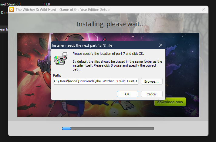 Download all parts then extract them all with winrar then download the game, it will lead you to c drive if you click on the shortcut so what you have to do is go to bin then x64 then locate the file called "Witcher3.exe" and make a shortcut of it. The comment was probably a joke but before I didn't know what to do with games that have multiple parts.